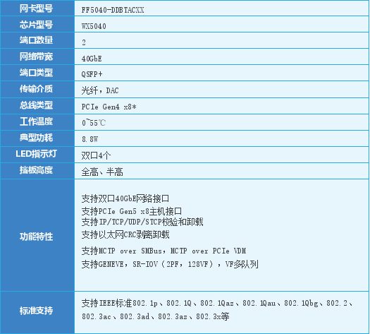 (兼容PCIe Gen4/3/2/1,x4/x2/x1),支持2×40G端口,支持硬件隔离与虚拟化。FF5040为云计算、网络安全、