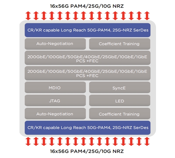它还是第一个完全兼容IEE 802.3cd标准(定义了基于PAM4的50GbE端口类型)的PHY物理层方案,针对50/200/400GbE网络上的QSFP-DD、QSFP端口做了优化。